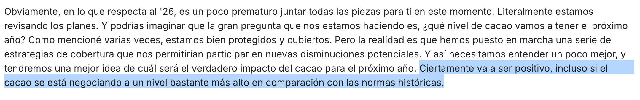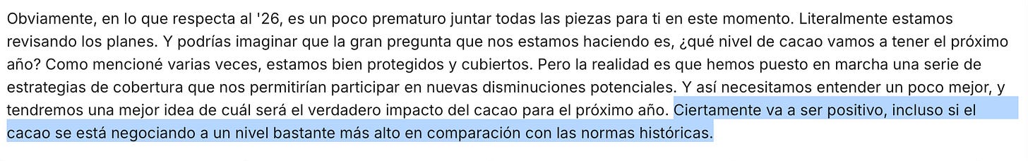 En particular, el tema de los precios de cacao me parece algo claramente temporal, y que mejorará para 2026 tal y como comentaron en la call.