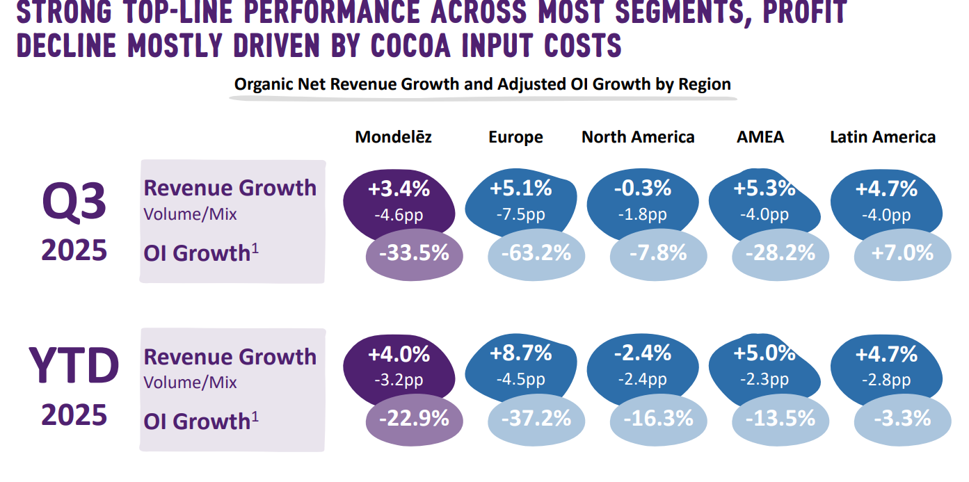 La empresa ha sufrido dos importantes problemas en estos últimos resultados, el primero es la debilidad en el consumo en USA que ha impactado en los volúmenes al igual que hemos visto en otras empresas, y el segundo es el impacto por los precios del cacao, aunque con mejores previsiones para 2026.