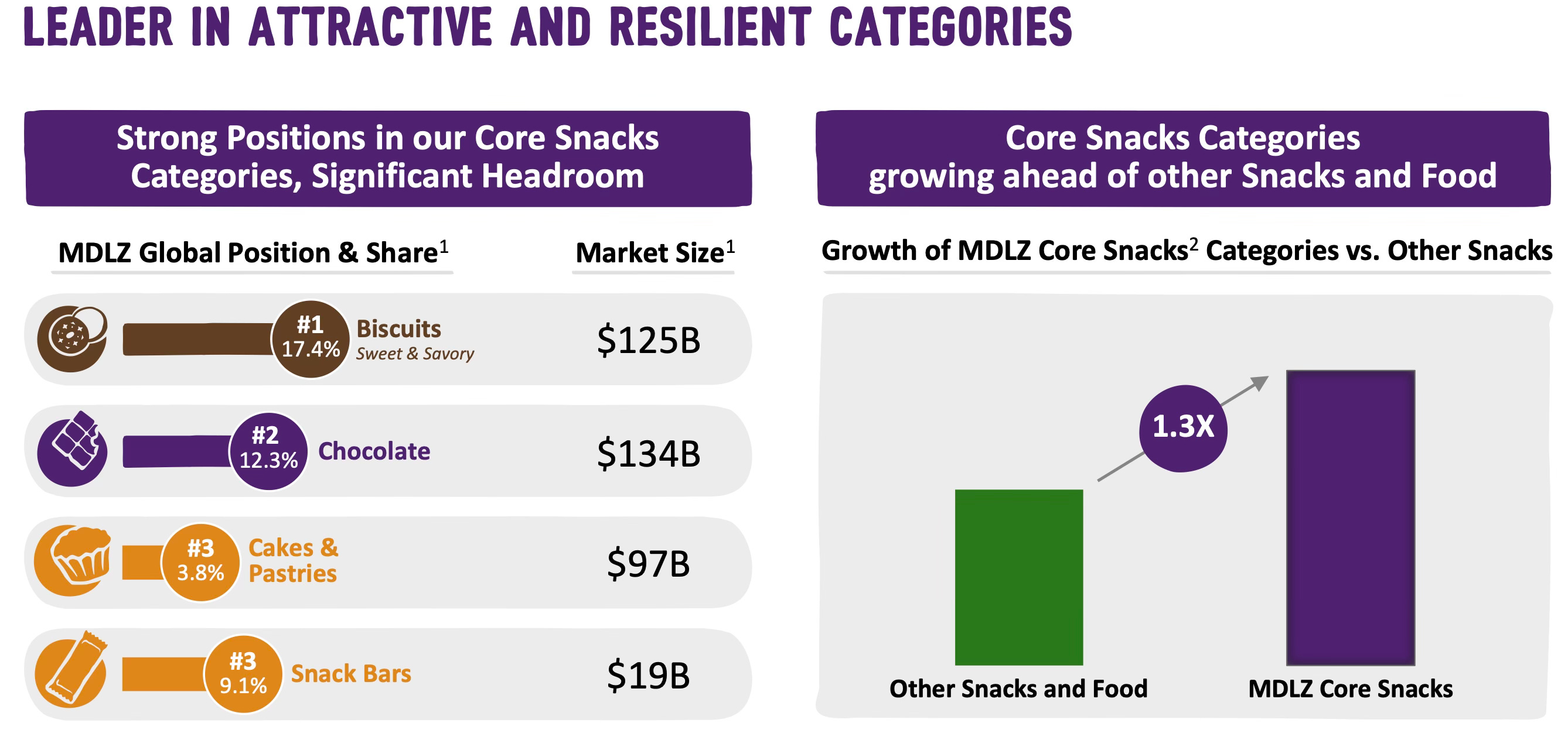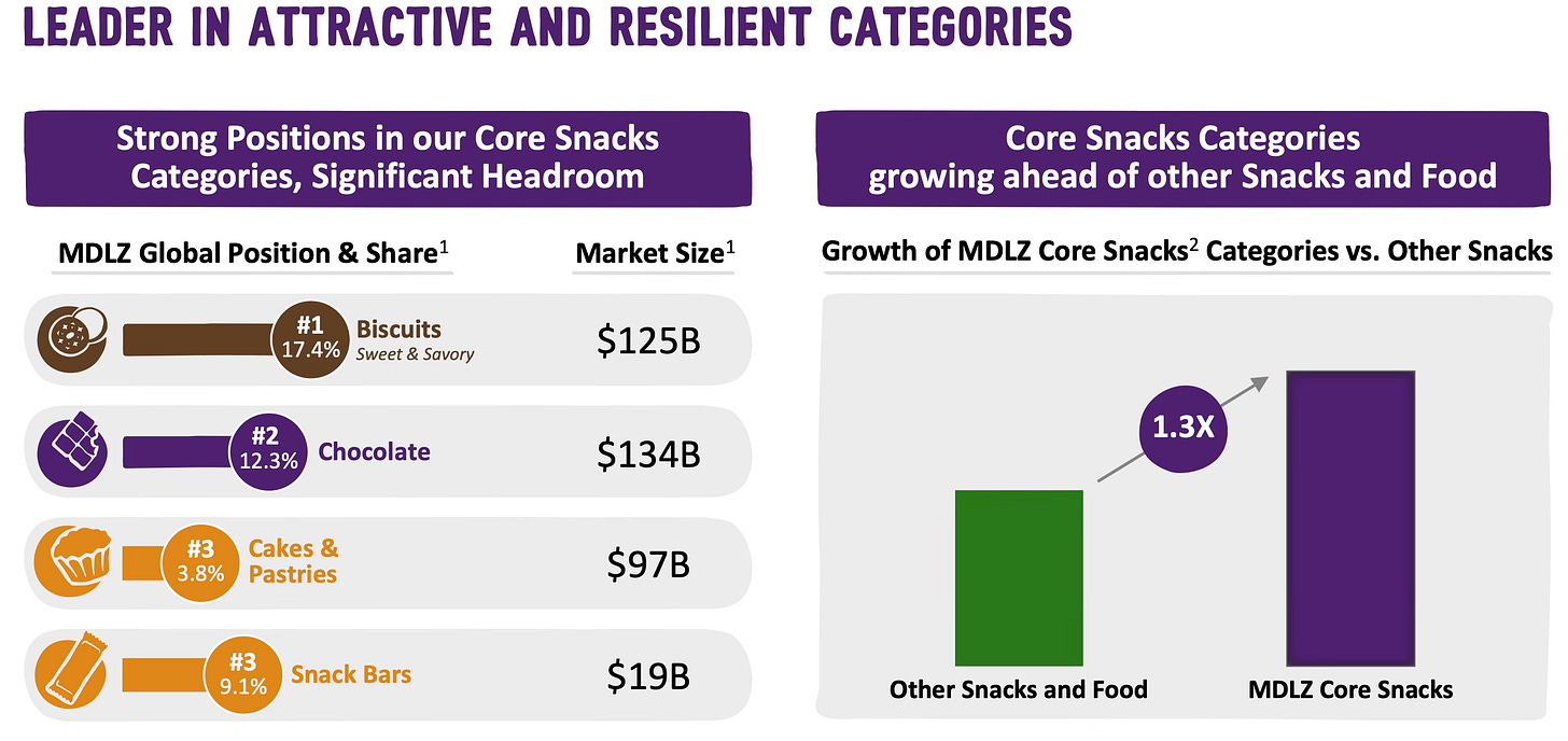 Mondelez es un negocio que me encanta porque reúne mucho de los requisitos que la hacen especial para ser duradera. Está muy bien diversificada geográficamente, con una exposición del 39% a mercados emergentes. Tiene marcas icónicas en productos adictivos (cada vez más consumidores lo hacen a diario) con ventas superiores al billón de dólares como Oreo, Cadbury, Milka o Toblerone. Es líder en el sector de galletas y número 2 en chocolate (sólo por detrás de Mars) en mercados con un tamaño aún muy grande.