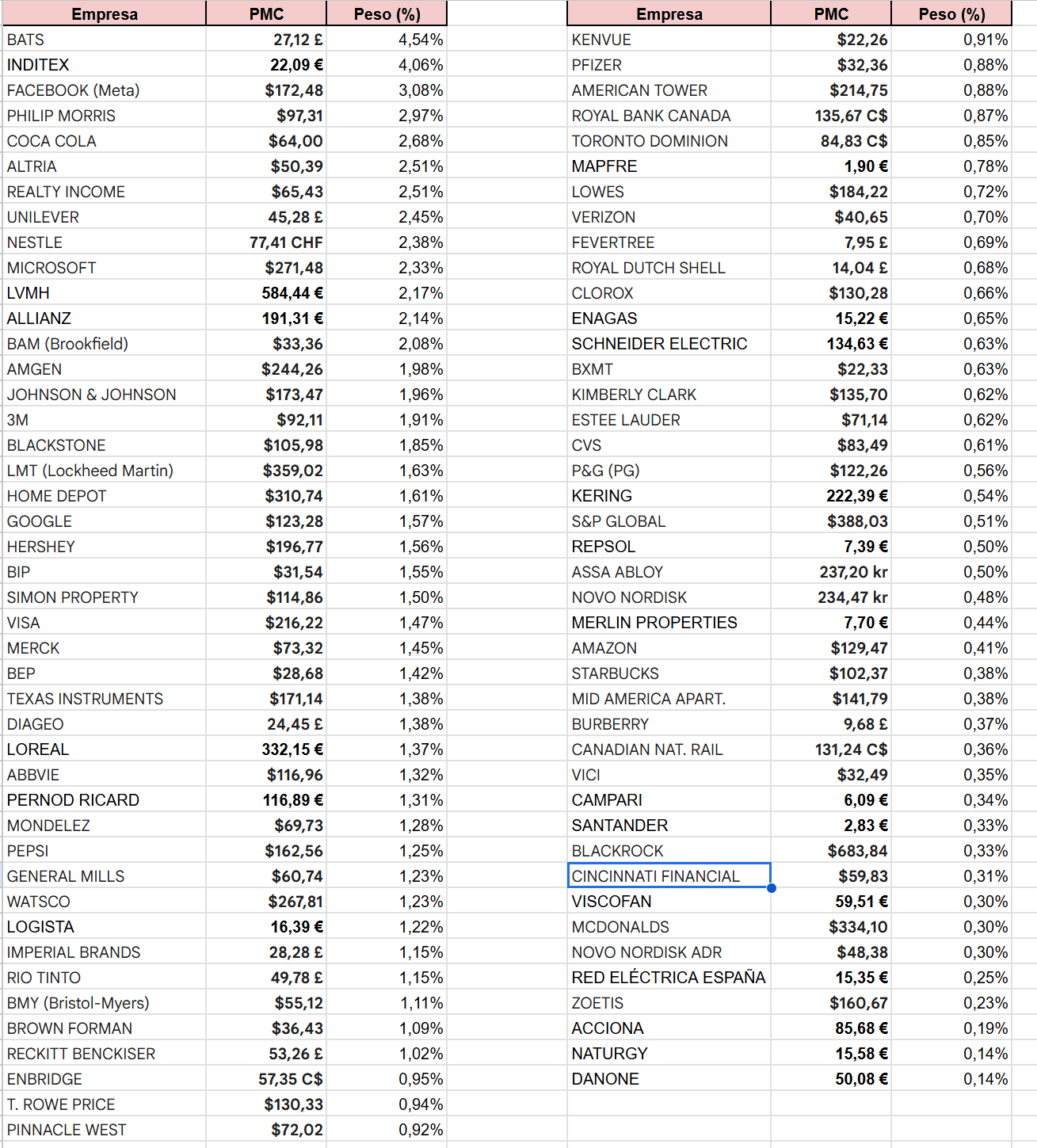 Rio Tinto, Canadian National Railway, Pepsi, Novo Nordisk, Nestlé, Hershey, Fevertree, L’Oreal, Coca Cola, BATS, Kenvue, Texas Instruments, BIP, T.Rowe Price, Kimberly Clark, Procter and Gamble, Zoetis, Kering, Pfizer, Altria, Estee Lauder, BEP.