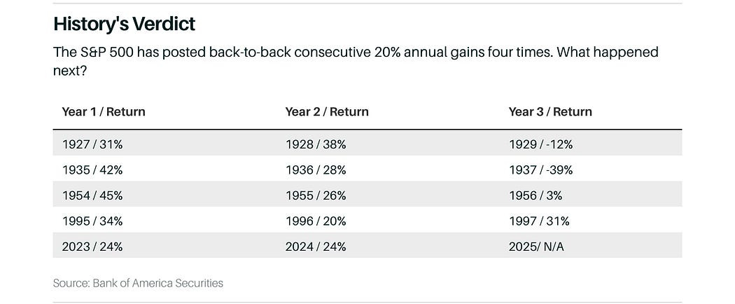 Hablando de rentabilidad, el año pasado traía un gráfico en el que se mostraba como la historia dice que después de 2 años seguidos con rentabilidades superiores al 20% en el SP500, al año siguiente, en 3 de los 4 casos registrados, la rentabilidad había sido muy inferior, con excepción del año 1997 en el que el rally siguió con un +31%.